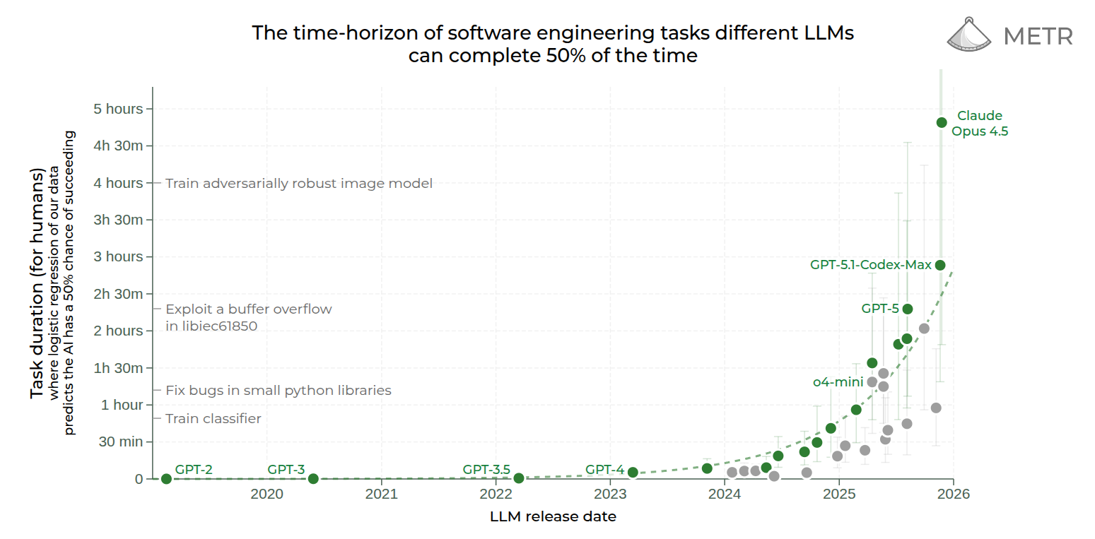 METR står för "Model Evaluation & Threat Research". De är ett oberoende forskningsinstitut som i våras blev kända när de hittade något liknande Moores lag för AI-kapabilitet. De såg att det historiskt tagit sju månader för AI-modellerna att bli så mycket bättre att de klarar dubbelt så långa digitala sysslor med en viss (50 eller 80) procentandel lyckade uppgifter (mätt i hur lång tid det tar för en människa att utföra dem). Snarare än att utvecklingen under resten av året saktade ned så såg den ut att gå ännu snabbare. En teoretisk anledning att tro att kurvan är superexponentiell, alltså att dubbleringstiden minskar, är bland annat att AI snart kan hjälpa till med forskningen och redan hjälper till med programmeringen. Jag tror att under 2026 ökar hastigheten till att vi har 5 månader som dubbleringstid.