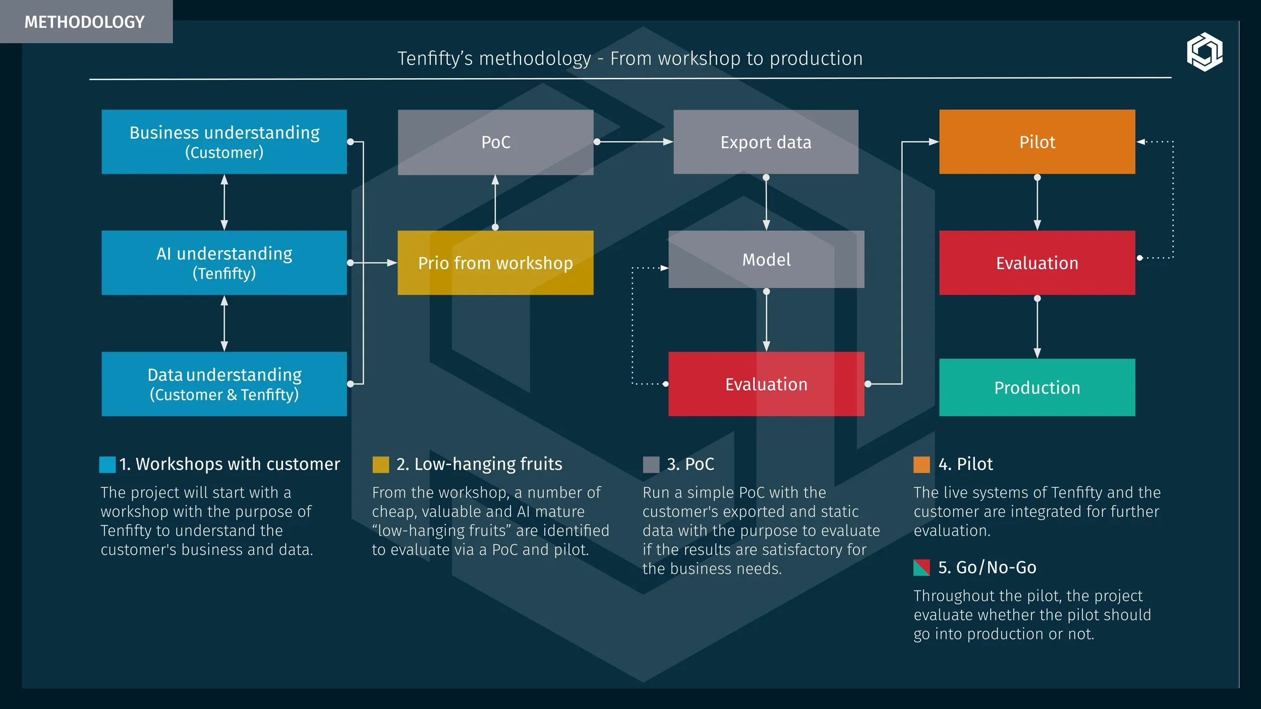 På Tenfifty har vi en genomarbetad metod för hur vi tar oss an våra AI-projekt. Det här upplägget hjälper oss och våra kunder från det första mötet hela vägen in i mål. Oavsett om målet är en prototyp, en pilot eller en driftsatt affärsapplikation. Det är absolut inget hokus pokus, modellen bygger på CRISP-DM, ursprungligen framtaget på 90-talet av IBM, och som blivit ett vanligt tillvägagångssätt när man jobbar med tunga dataprojekt.